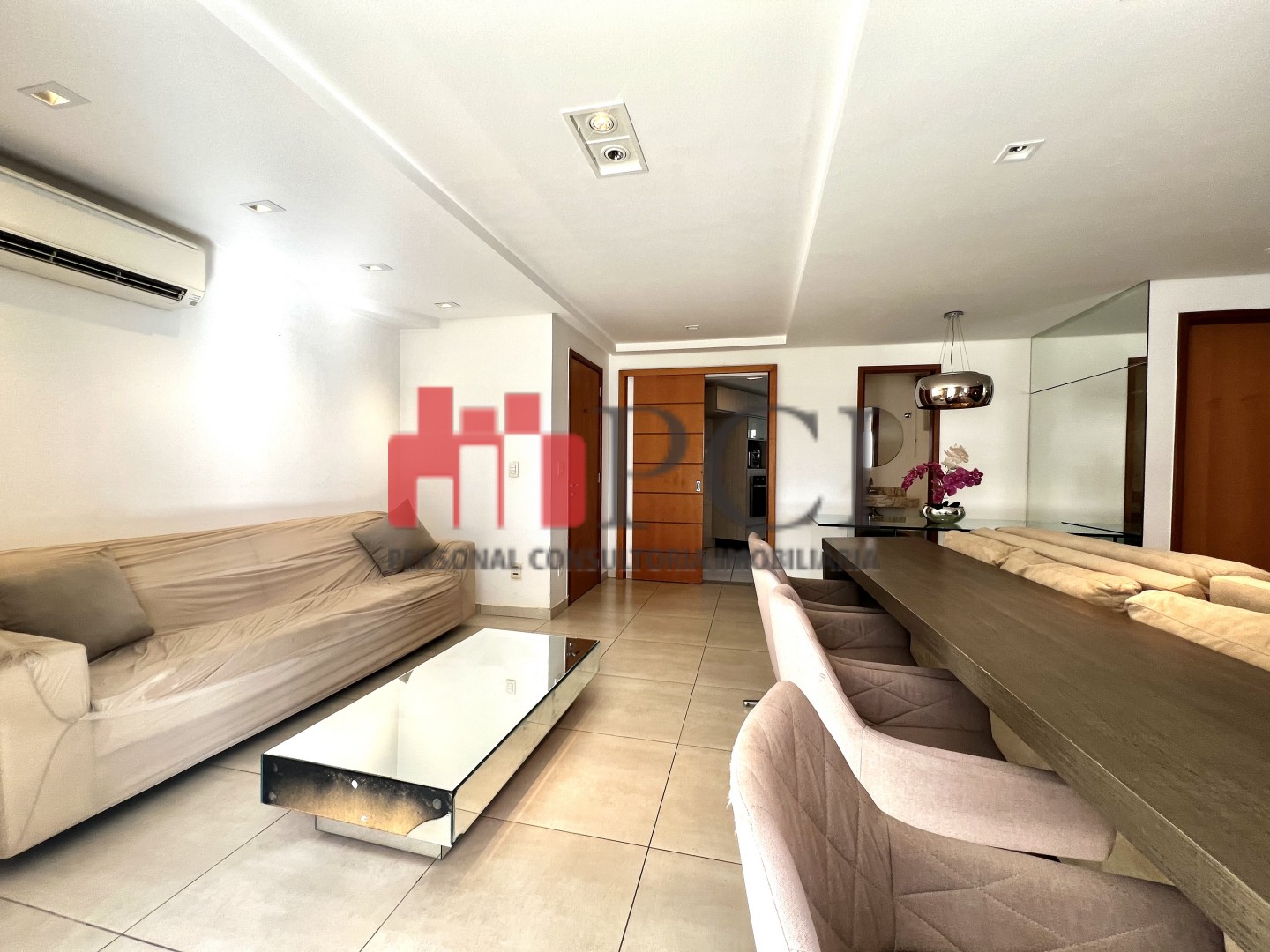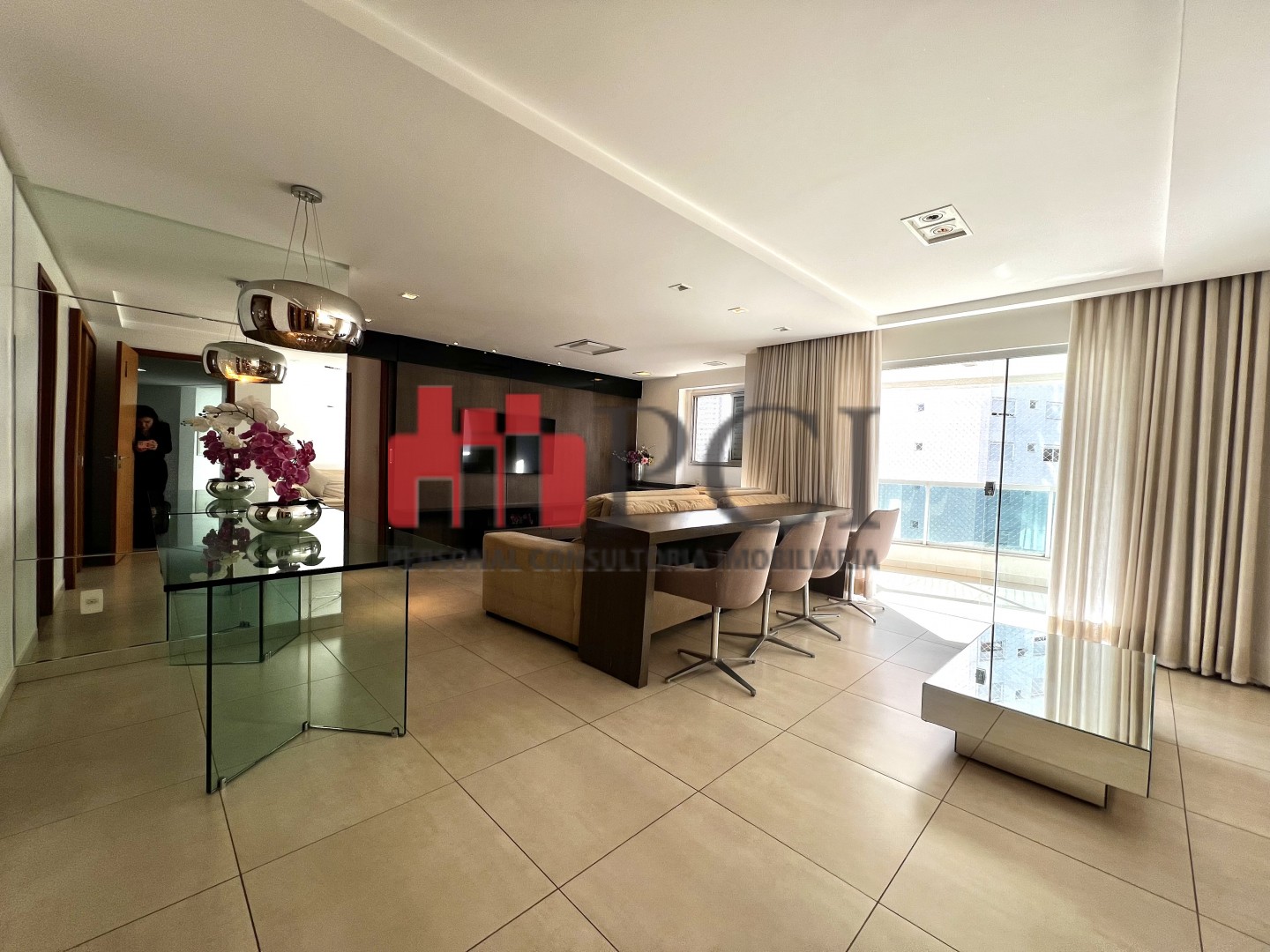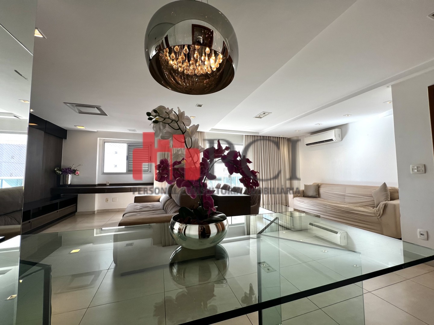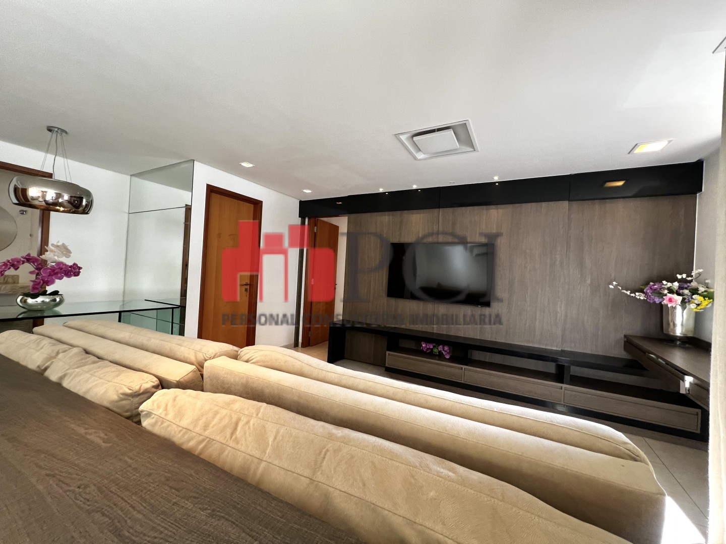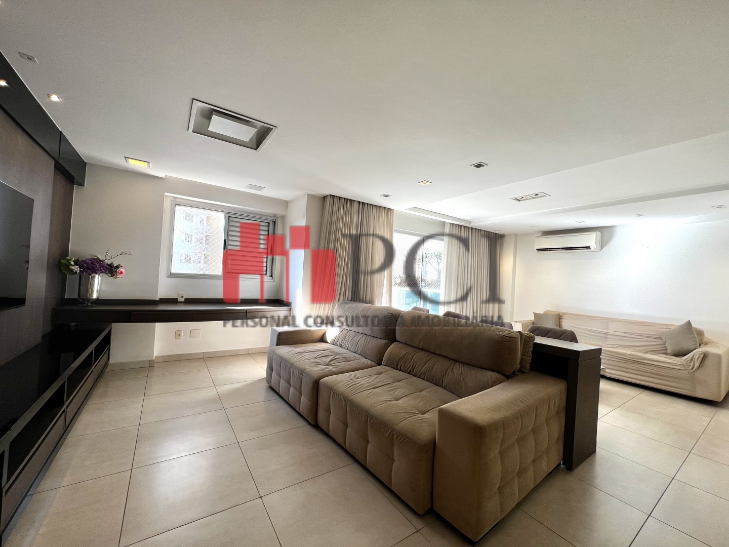 A sala ampla comporta três ambientes integrados e recebe excelente iluminação natural,