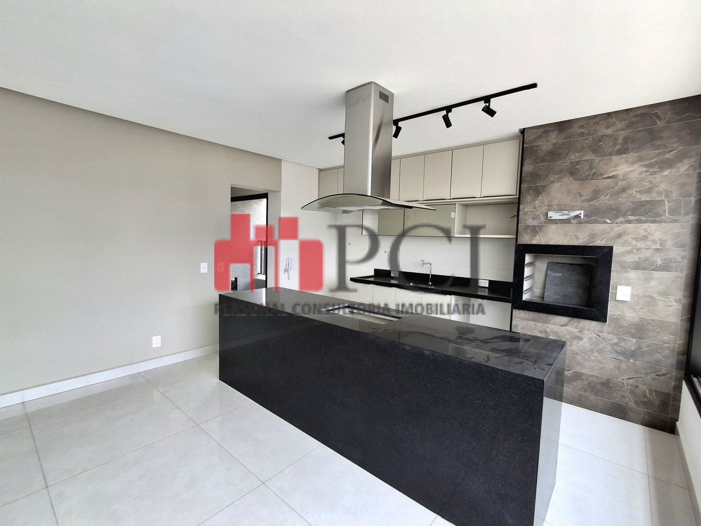 A sala é extremamente ampla, integrada a uma cozinha moderna, equipada com coifa e armários planejados, além de uma charmosa churrasqueira.