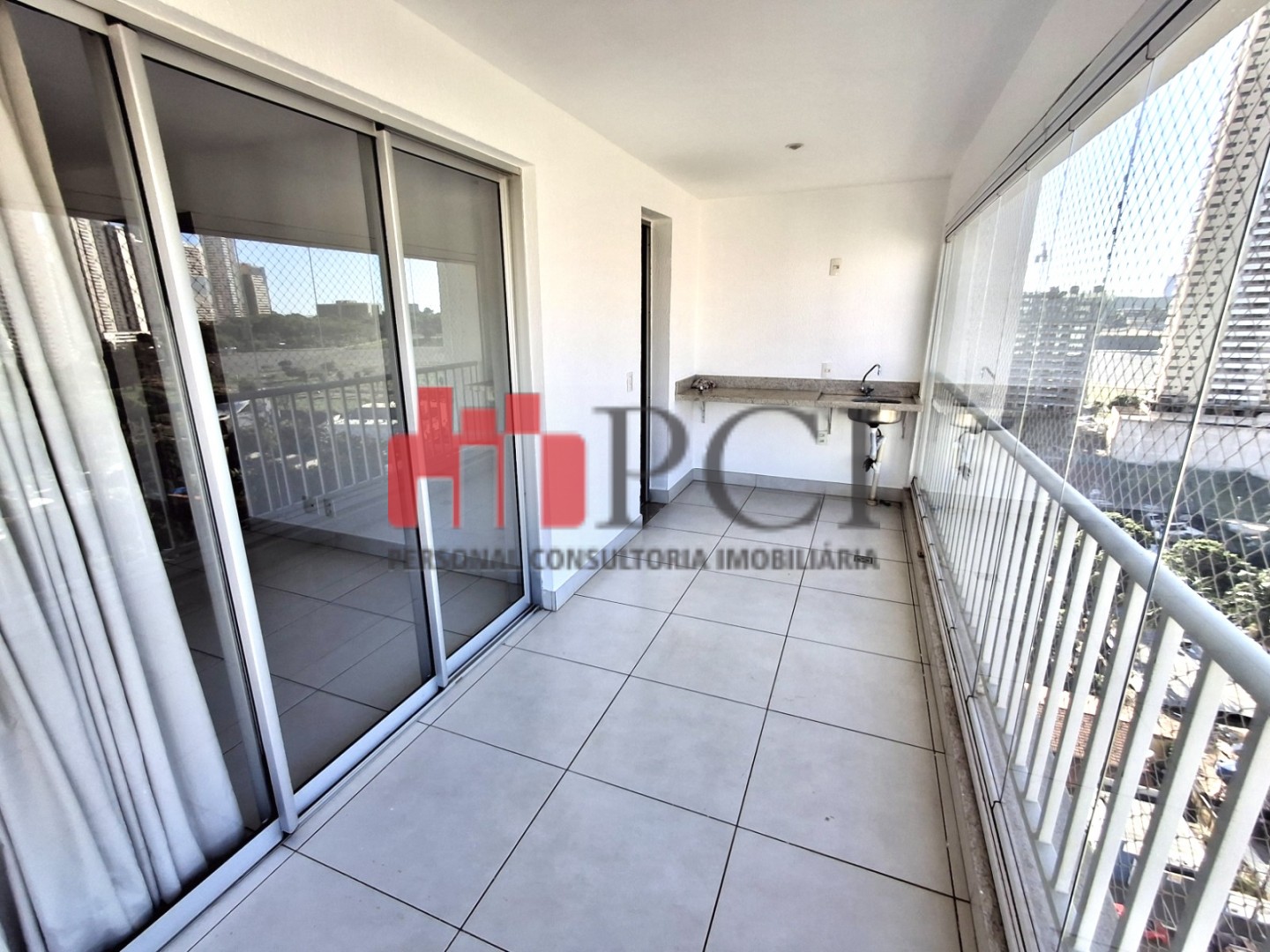 Na varanda, uma elegante cortina de vidros.