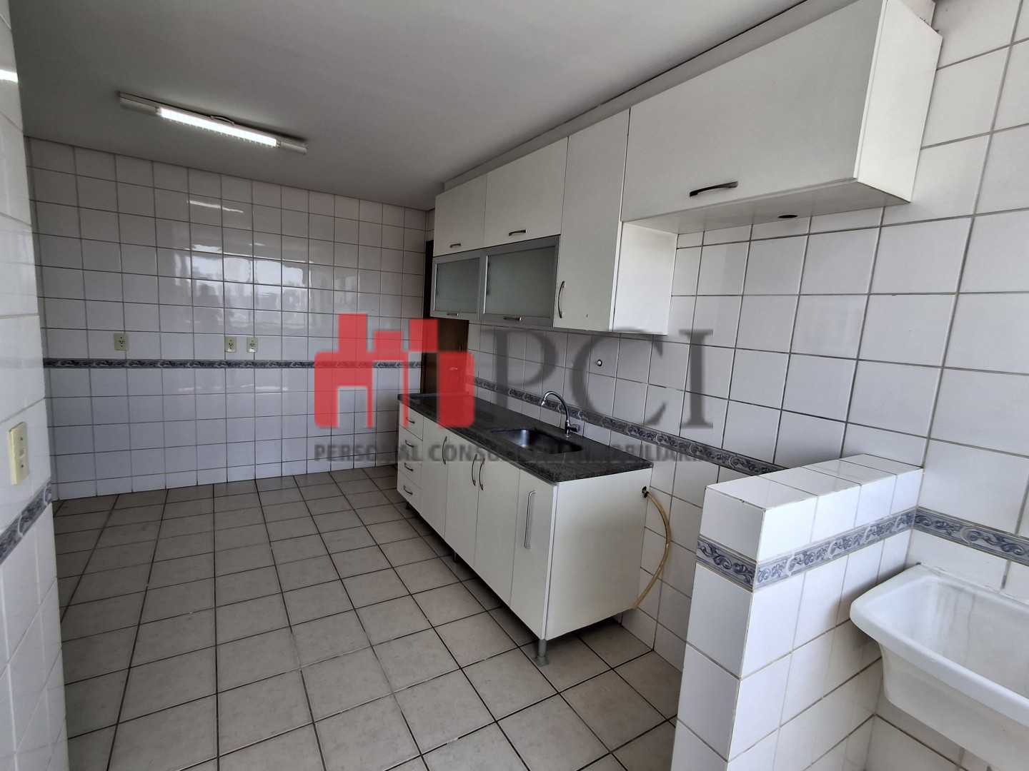 A sala de estar é espaçosa e iluminada, conectando-se à cozinha equipada com armários planejados e à área de serviço.